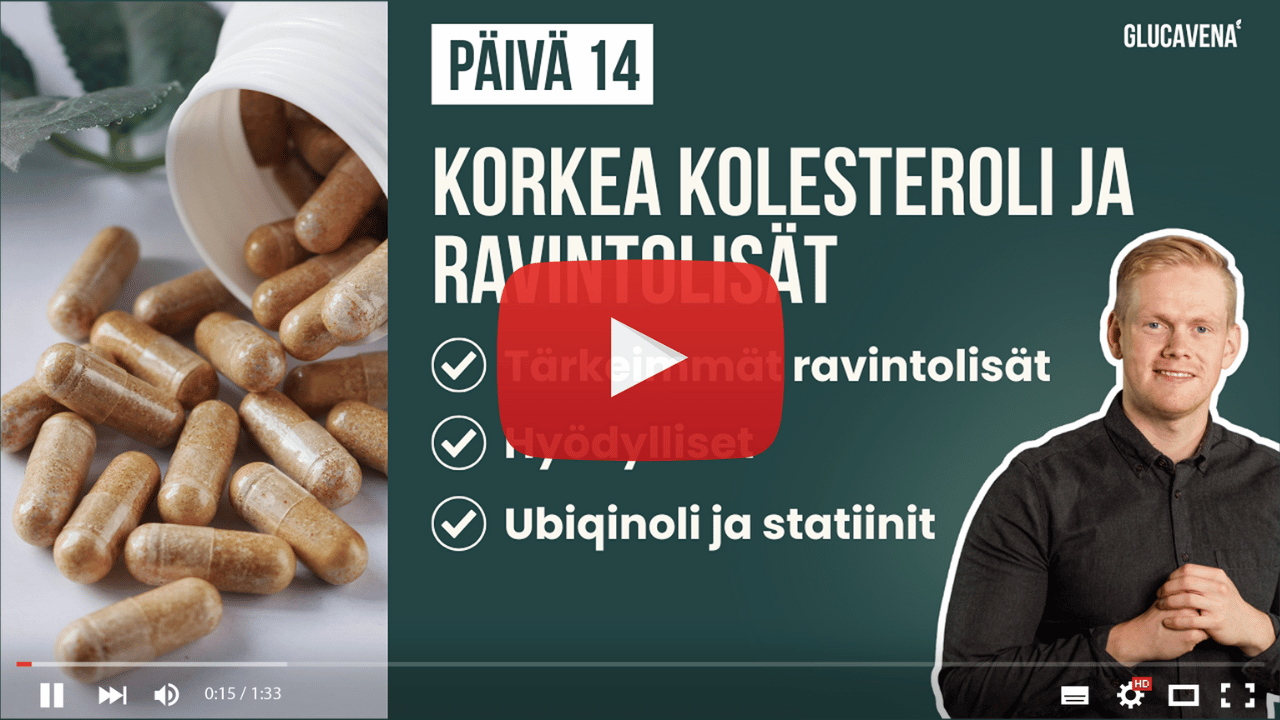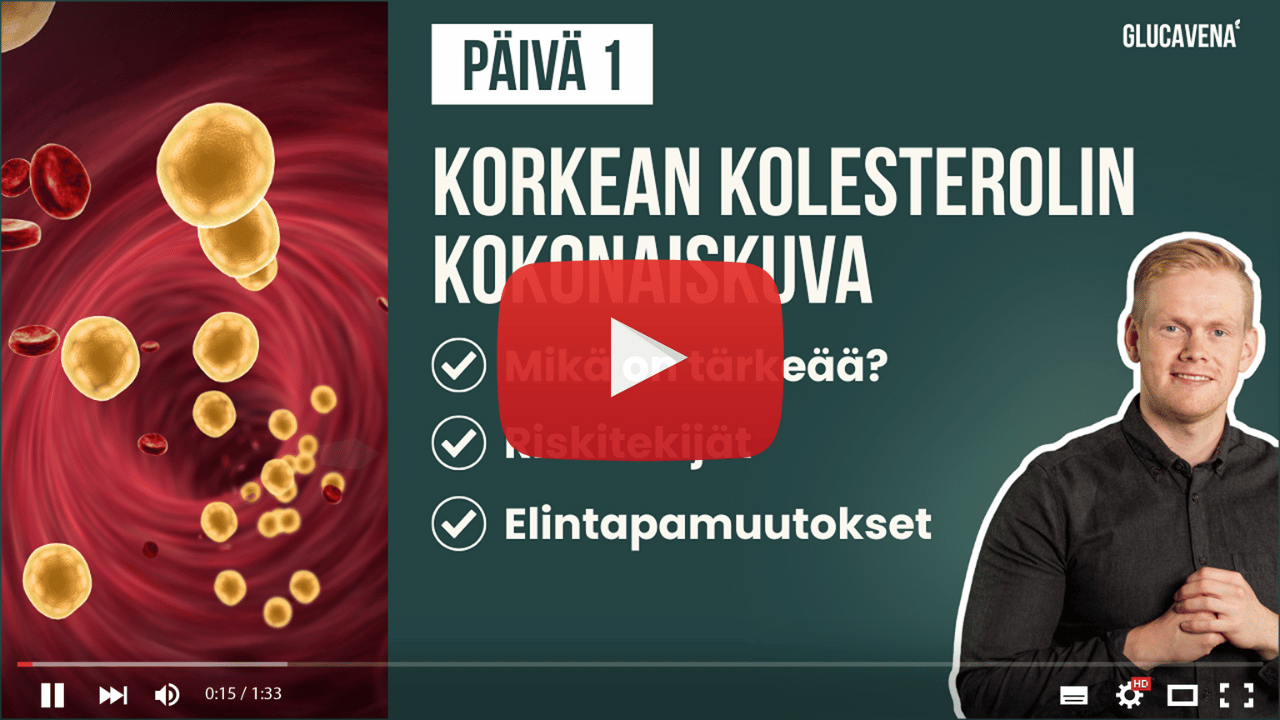 Eroon korkeasta kolesterolista 30 päivässä on Glucavenan ja Jerry Hietaniemen uusi verkkovalmennus, joka auttaa sinua alentamaan korkeaa kolesterolia, alentamaan verensokeria, vähentämään sisäelinrasvaa ja hillitsemään hiljaista tulehdusta. Lopputuloksena sydänsairauksien ja komplikaatioiden riski pienenee, toimintakykysi paranee ja olosi on energisempi.