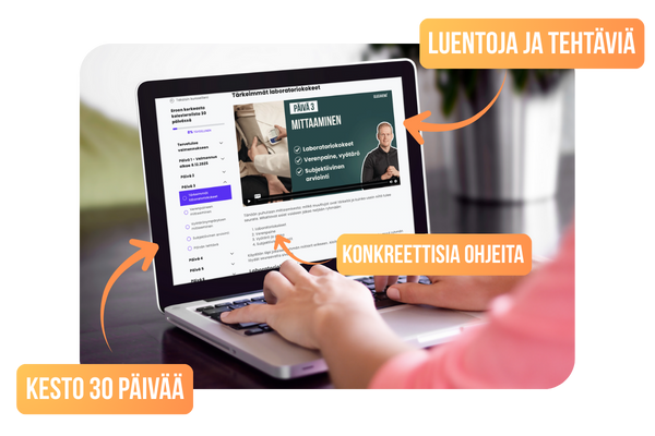 Tämän verkkovalmennuksen avulla otat oman terveytesi hallintaan heti 7.1. Valmennus keskittyy pieniin, mutta sitäkin tärkeämpiin pysyviin muutoksiin elintavoissasi kuten ravitsemuksessa ja liikunnassa. Ensimmäiset näkyvät tulokset tulet huomaamaan jo ensimmäisten päivien aikana.